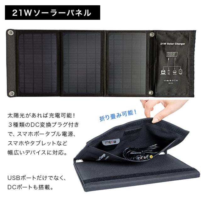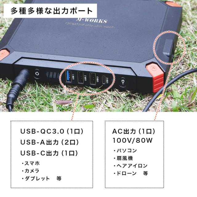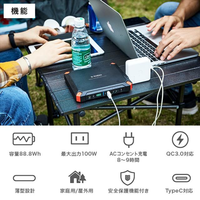 【仕様】[バッテリー]リチウムイオン [バッテリ容量]88.8Wh 24000mAh 3.7V [入力]DC DC13.5V〜24V/1A(最大) [USB出力]USB×2 5V-2.1A、USB×1 5-9V/2.1A(QC3.0)、USB-C×1 5-9V/2.1A(QC3.0) [AC出力]100V/60Hz・80W/100W(最大) [充電時間]約8〜9時間 [充電回数]500回 [ソーラーパネル容量]21W [ソーラーパネル出力]DC18V(MAX)、USB5V(MAX)