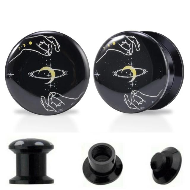 ダブルフレア型の黒のアクリル樹脂製のプラグに上下から三日月に魔法の粉をかけている手をデザインしたボディピアス。