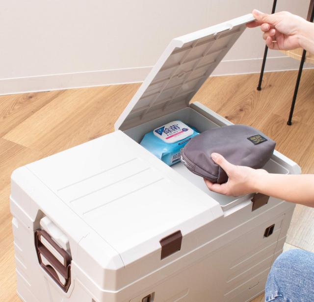 収納スペースが付いたフタは、ちょっとした物の一時置きなど簡易のテーブルとしても使用できます。フタを外せばボックスの上から収納が可能です。