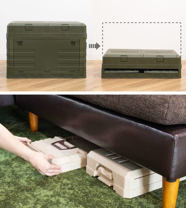 コンテナは折りたたむと本体は高さ約6.5cmとコンパクトになります。フタと本体を重ねても高さ約15.7cmなので、使わないときは家具やクローゼットの隙間など、ちょっとしたスペースに収納できます。折りたたんでおけば車にも積んでおきやすいので、いざというときに役に立ちます。