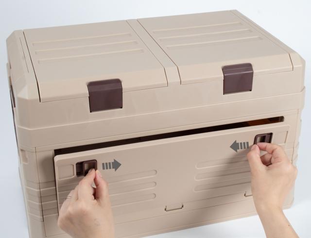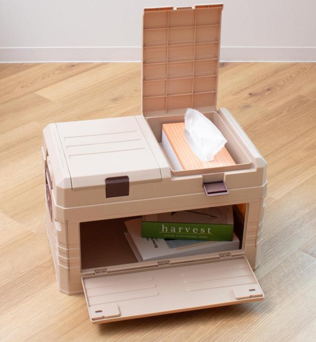 フタに収納が付いた2WAYオープン式の折りたたみコンテナ