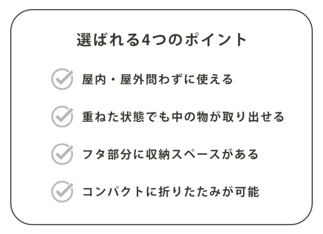 フタ付きの折りたたみ式コンテナは、屋内・屋外問わずにどこでも便利にお使いいただけます。生活感を隠せるので、リビングやキッチンなどの見えるところに置いてもおしゃれなデザインです。フタを外せばスタッキングが可能なので、積み重ねて使用すればコンパクトに使えて、生活シーンにも気軽に取り入れられます。使い勝手の良い機能性はアウトドアシーンでの使用にもおすすめです。