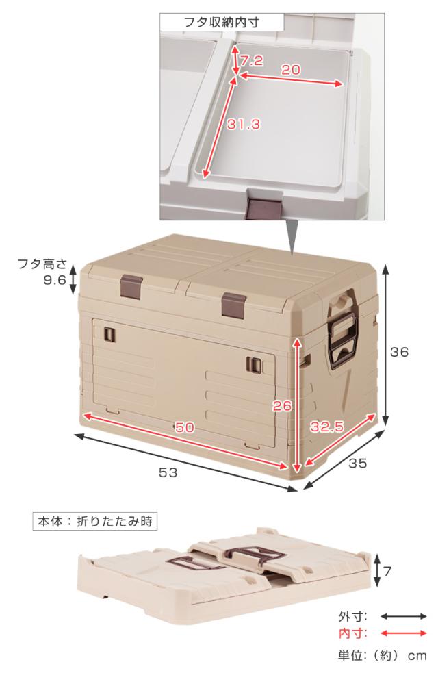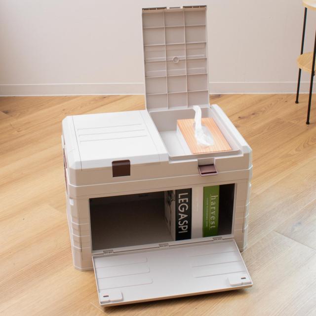 フタに収納が付いた2WAYオープン式の折りたたみコンテナ