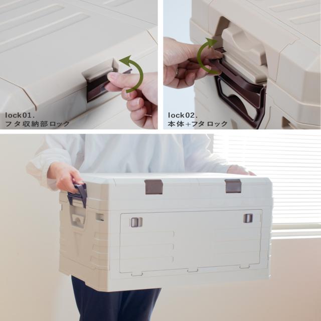 もう一つは『本体とフタ』を繋ぐロックです。本体ボックスにフタを載せる際に、本体とフタを固定できるロックがあるので、持ち運びの際にフタがズレて落下する心配がありません。持ち手付きで移動の際も、ラクに持ち運びができます。