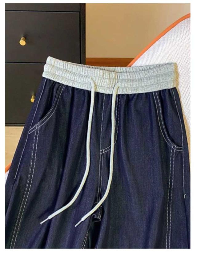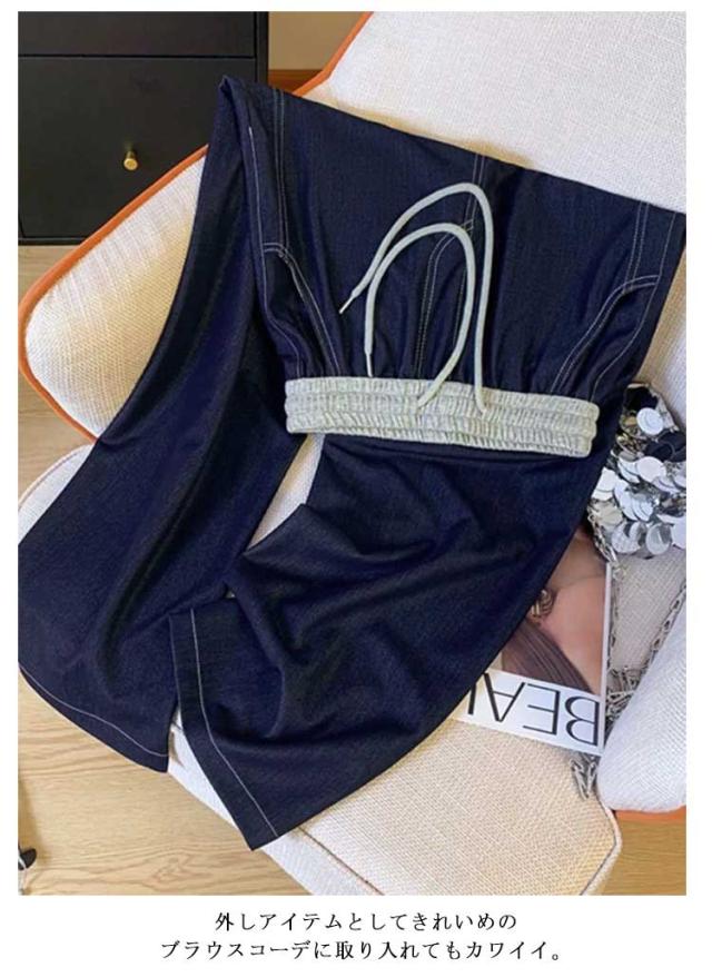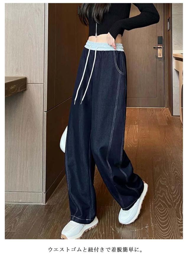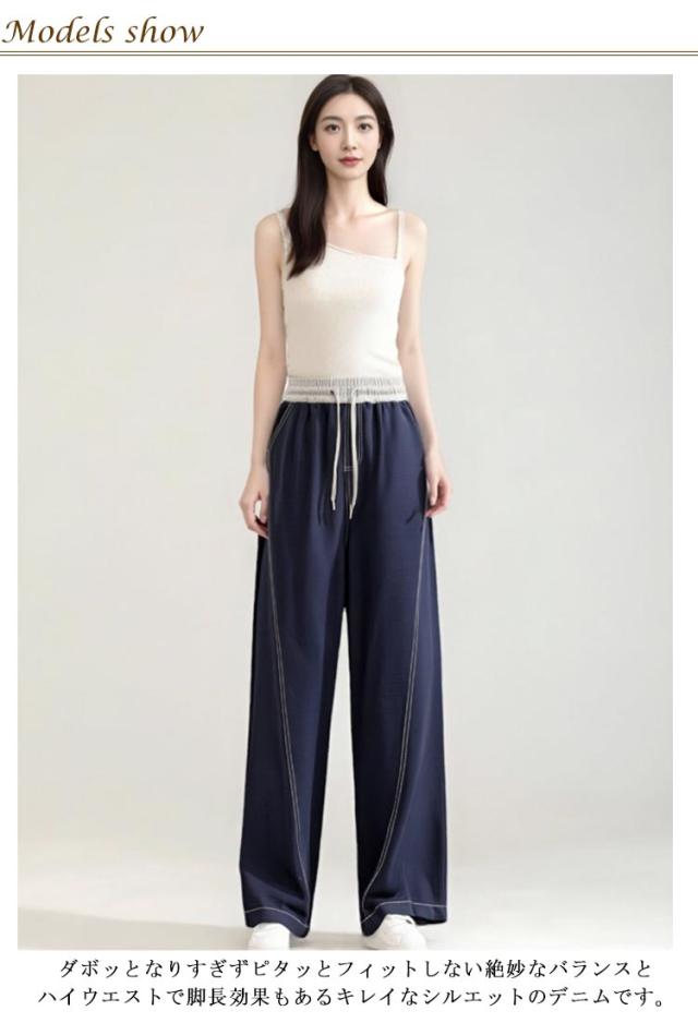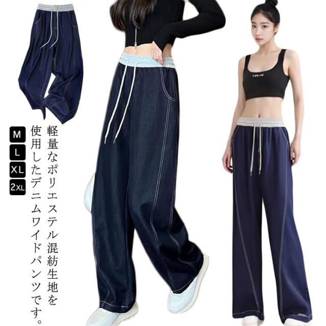ワイドパンツ デニム 春夏 レディース デニムパンツ ブルー 薄手 ストレート ハイウエスト ボトムス ウエストゴム 紐付き ジーンズ ジーパン 着痩せ 秋 かわいい おしゃれ 大人 ゆったり カジュアル 着回し 送料無料