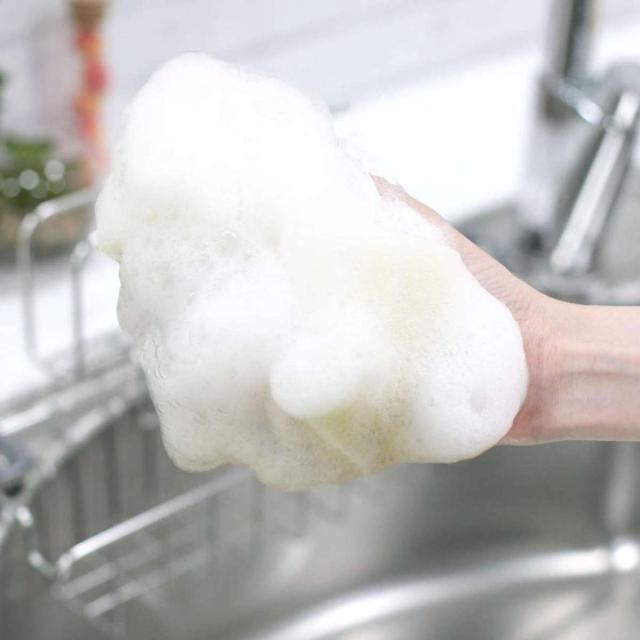 少しやわらかめのスポンジで、しっかり汚れを落とせます。泡立ちが良く、サッと洗うだけで汚れをしっかりキャッチ。水切れも抜群なので、すすぎが早く節水にも役立ちます。