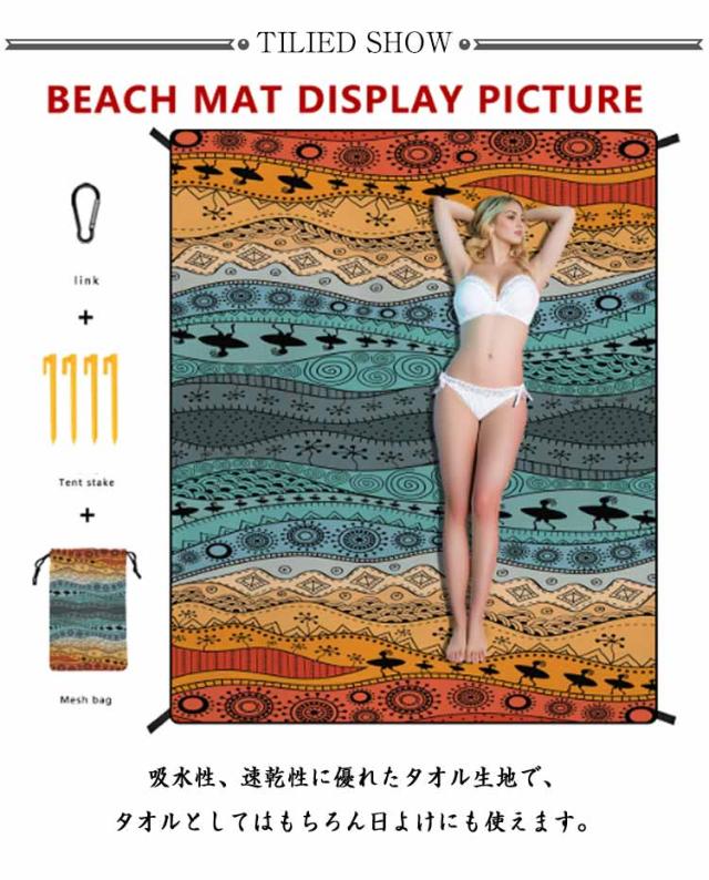 | おしゃれな柄の大きめビーチタオルです。 吸水性、速乾性に優れたタオル生地で、タオルとしてはもちろん日よけにも使えます。 家族みんなでゆったり過ごせる、約180x220cmの大きめサイズ。 マットの四隅のペグ穴に専用ペグを差し込めば、しっかり地面に固定でき、風が強い日もめくれ上がる心配がありません。 キャンプやピクニックはもちろん、運動会やフェス・屋外ライブでのご使用もおすすめ。 また、お部屋のインテリアにマッチするデザインなので、お家でラグのように使用することもできます。 | |