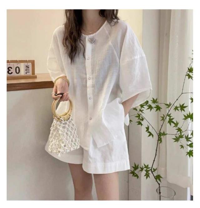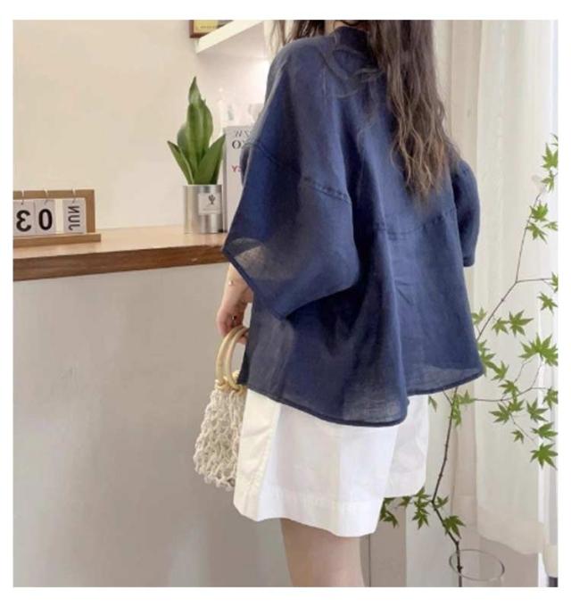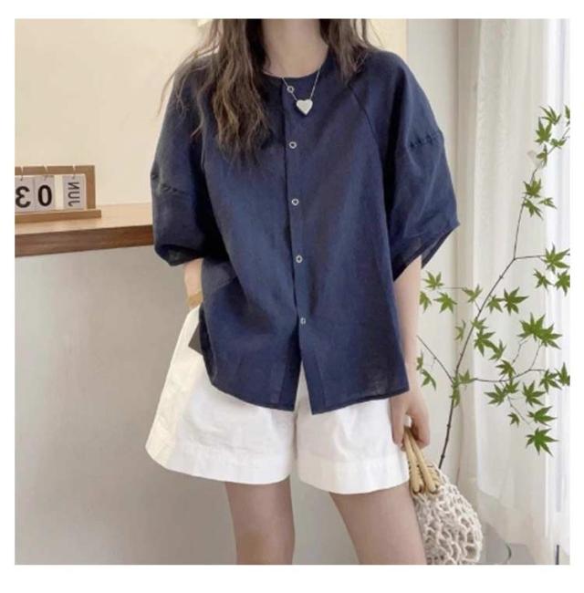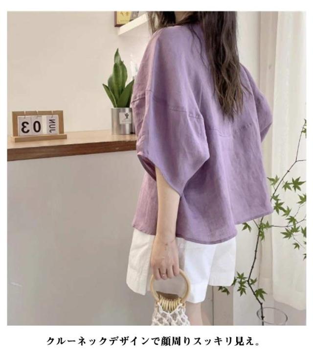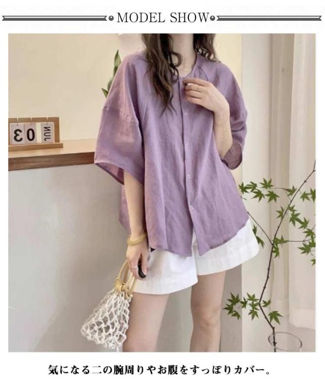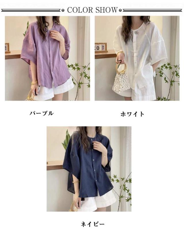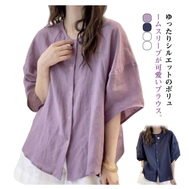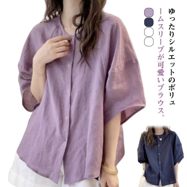 シャツ ブラウス ボリューム袖 丸首 レディース 夏 トップス 半袖 シャツブラウス Uネック 襟なし 薄手 ゆったり 体型カバー 半袖ブラウス ボリュームスリーブ 大人可愛い 無地 シンプル きれいめ おしゃれ 夏物 白 ホワイト パープル ネイビー 紺 大きいサイズ 【送無】