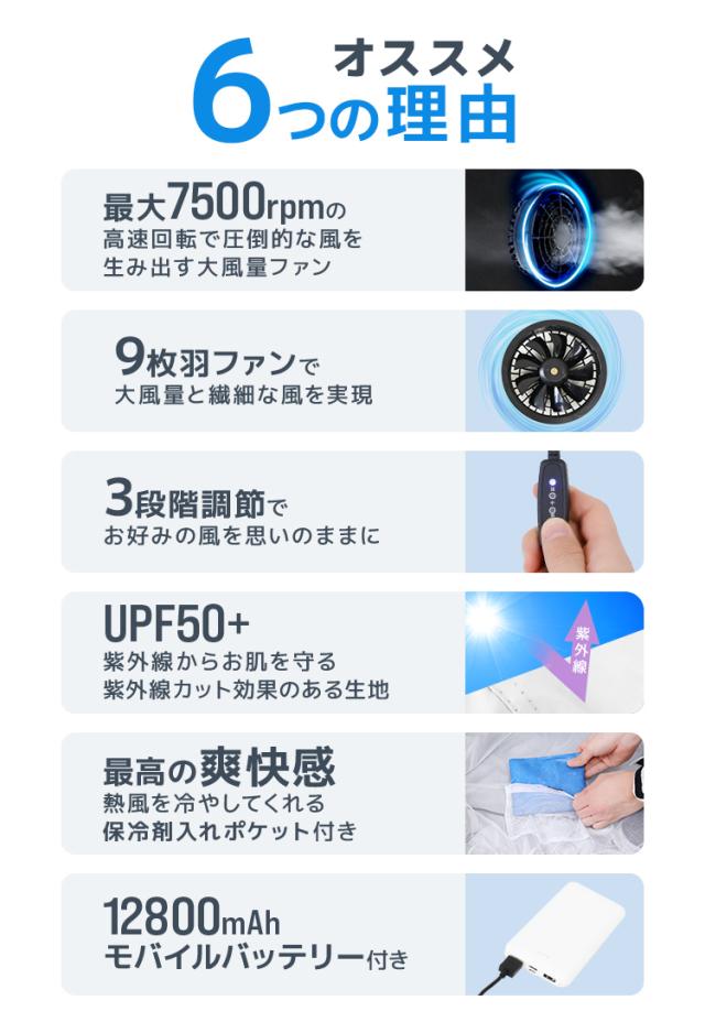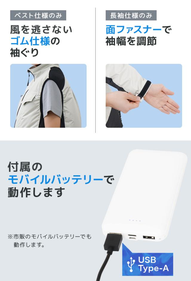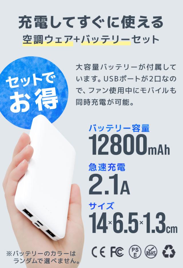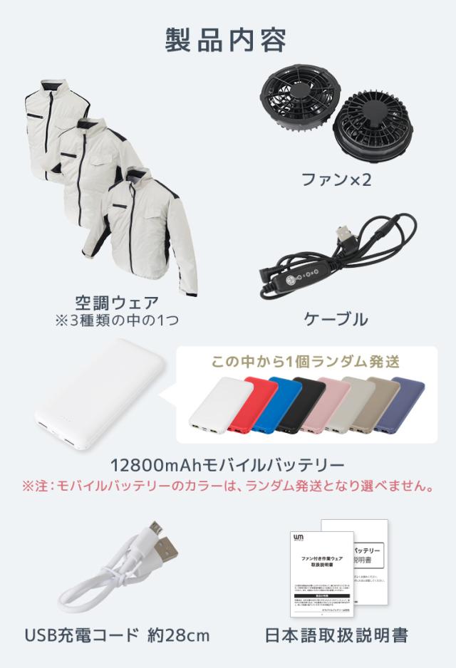 | 内容 | 空調ウェア<ベスト>×2枚 ファン×2 ケーブル×1 12800mAhモバイルバッテリー×1 ※バッテリーのカラーはランダム発送となり選べません。 USB充電コード(約28cm)×1 日本語取扱説明書 |