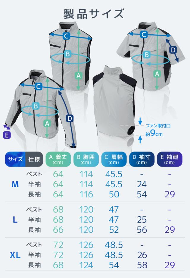 M:着丈64cm 胸囲114cm 肩幅45.5cm L:着丈68cm 胸囲120cm 肩幅47cm XL:着丈72cm 胸囲126cm 肩幅48.5cm |