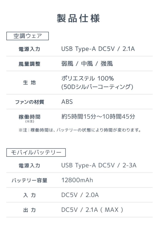 電源入力:USB Type-A CD5V / 2.1A 風量調整:3段階(弱風 / 中風 / 強風) 生地:ポリエステル100%(50Dシルバーコーティング) ファンの素材:ABS 【モバイルバッテリー】 電源入力:USB Type-A CD5V / 2.1A バッテリー容量:12800mAh 入力:DC5V / 2.0A 出力:DC5V / 2.1A(MAX) |