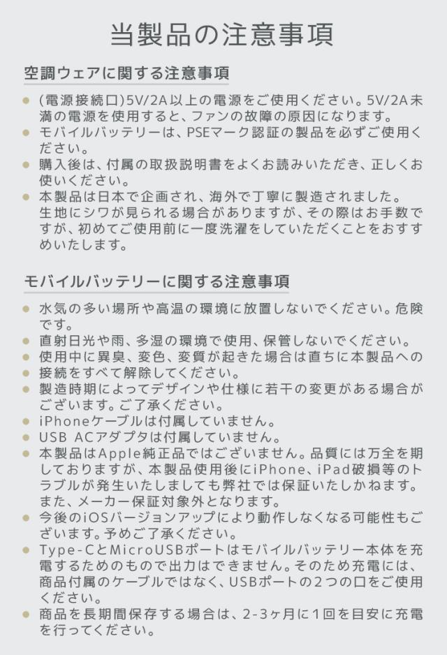 【空調ウェア】 ・5V/2A以上の電源をご使用ください。5V/2A未満の電源を使用するとファンの故障の原因になります。 ・モバイルバッテリーはPSEマーク認証の製品を必ずご使用ください。 ・購入後は付属の取扱説明書を確認してからご使用ください。 【モバイルバッテリー】 ・iPhoneケーブルは付属していません。 ・USB ACアダブタは付属していません。 ・商品は純正品ではございません。品質には万全を期しておりますが、使用後のiPhone、iPad破損等のトラブルが発生致しましても弊社では保証致しかねます。また、メーカー保証対象外となります。 ・今後のiOSバージョンアップにより動作しなくなる可能性もございます。予めご了承下さい。 ・商品を長期間保存する場合は、2〜3ヶ月に1回を目安に充電を行ってください。 ・商品は、モニターによって色合いが異なって見える場合があります。 ・仕様・デザインは改良のため予告なく変更することがあります。 |
