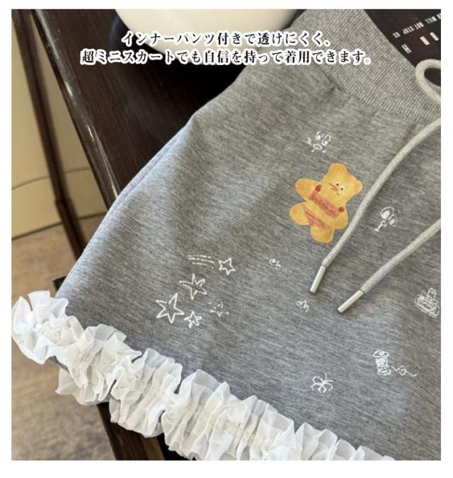 | カジュアルコーデに欠かせのきれいなミニスカート。 伸縮性のある柔らかスウェット生地。 コーディネートのバランスが取りやすいミニ丈。 かわいいプリント柄とフリルスカート、台形デザイン、エレガントでありながらガーリッシュで、重ね着の感覚があります。 アクセントをつけるウエスト紐付き。キュッと結ぶだけで可愛らしく、メリハリある仕上がりに。 ハイウエストの設計により、ウエストを引き締め、脚を長く見せる効果が期待できます。 インナーパンツ付きで透けにくく、超ミニスカートでも自信を持って着用できます。 | |