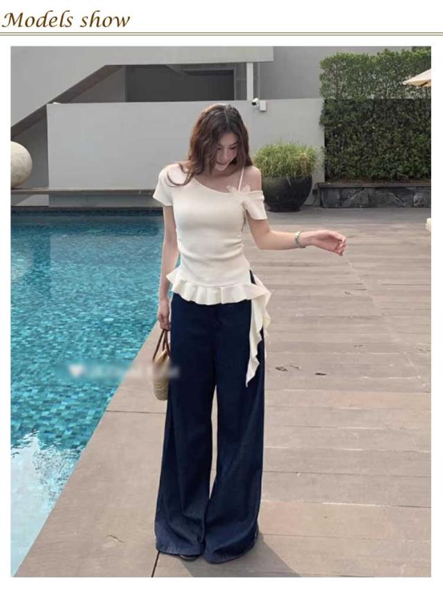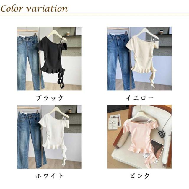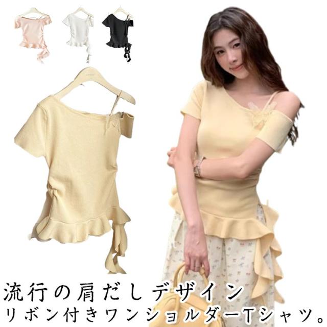 オフショルダー Tシャツ 半袖 リボン付き レディース セクシー 夏 薄手 オフショルダー アシンメトリー ワンオフショルダー 斜めライン 無地 フリル裾 スリム 女性 おしゃれ かわいい 細見え トップス カットソー 夏服 韓国ファッション