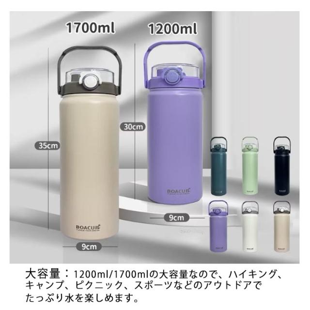 | 大容量:1200ml/1700mlの大容量なので、ハイキング、キャンプ、ピクニック、スポーツなどのアウトドアでたっぷり水を楽しめます。 2種類の飲み方: ストロー飲みと直接飲み。 保冷・保温に優れた真空断熱二重構造の水筒なので長時間の飲み頃の温度をキープします。 水筒耐食性の高い316ステンレススチールを採用し、BPAフリーなので、健康的で耐久性があり、臭いがない。 広口タイプで洗いやすくて隅々まで楽々と丸洗いできます、フタさえ分けて洗えます。 | |