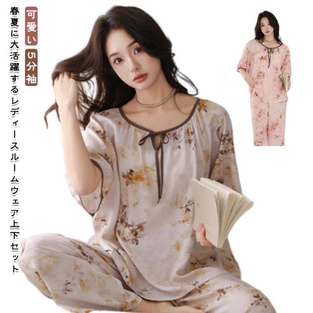 ルームウェア トレンド 半袖 パジャマ ラウンドネック 5分袖 夏服 ルームウェア ワンマイルウェア 可愛い セットアップ レディース 薄手 フリーサイズ 部屋着 パジャマ 寝間着 ゆったり 上下セット 体型カバー かわいい ギフト プレゼント