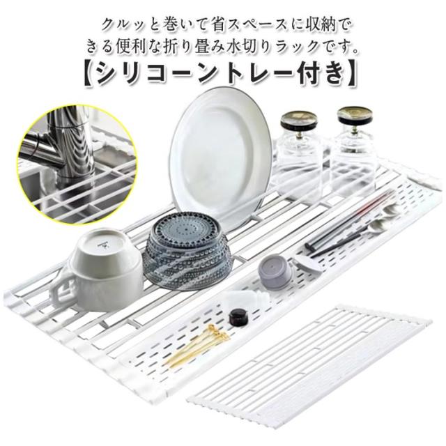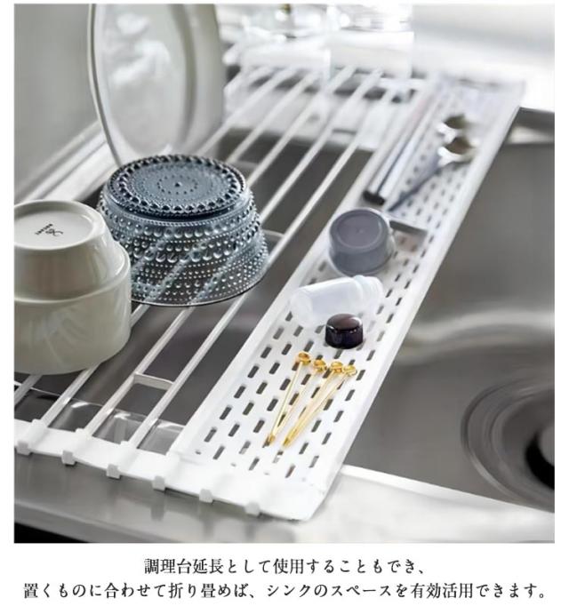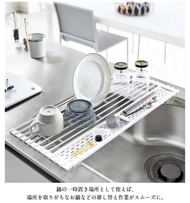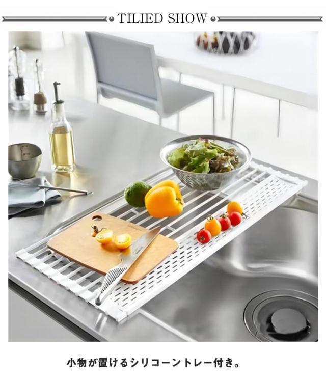 | クルッと巻いて省スペースに収納できる便利な折り畳み水切りラックです。【シリコーントレー付き】 小物が置けるシリコーントレー付き。 使わない時はくるくる丸めてコンパクトに収納できます。 調理台延長として使用することもでき、置くものに合わせて折り畳めば、シンクのスペースを有効活用できます。 鍋の一時置き場所として使えば、場所を取りがちなお鍋などの移し替え作業がスムーズに。 ワイヤーは取り外し可能なので、蛇口を避けて使うこともできます。 | |