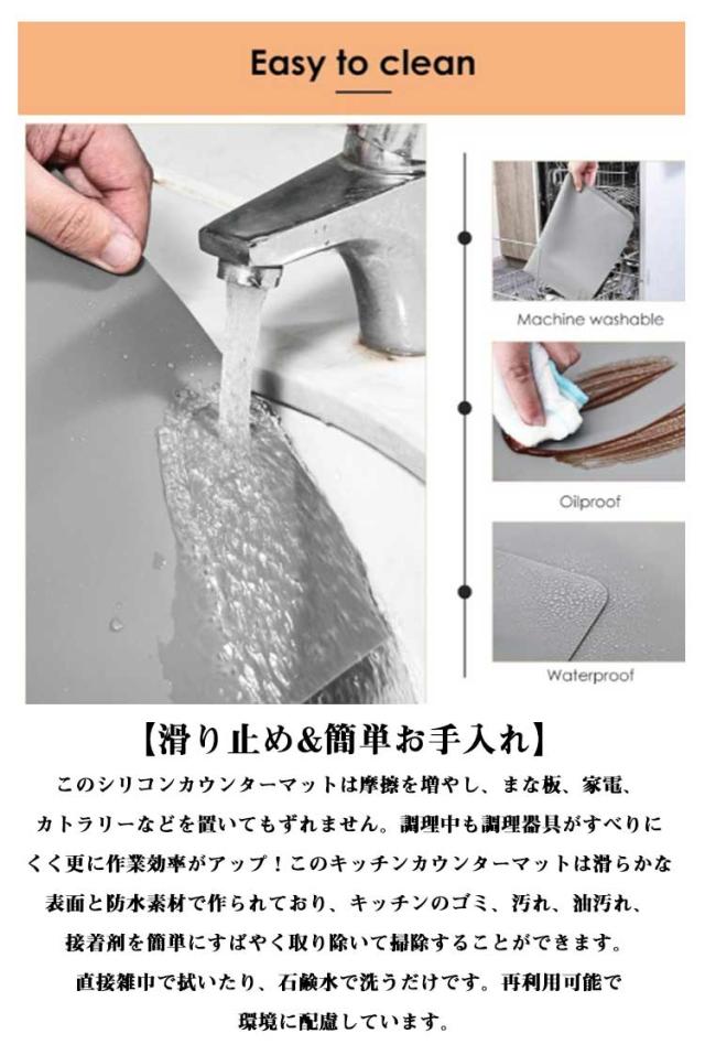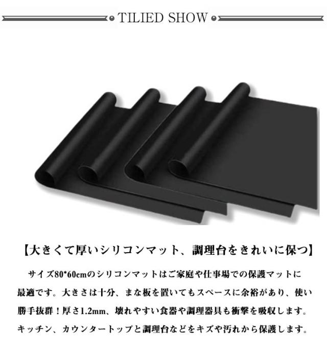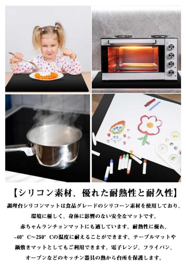 | 耐熱シリコンマット。【大判80*60cm?50*70cm】【透明?黒】 【大きくて厚いシリコンマット、調理台をきれいに保つ】サイズ80*60cmのシリコンマットはご家庭や仕事場での保護マットに最適です。大きさは十分、まな板を置いてもスペースに余裕があり、使い勝手抜群!厚さ1.2mm、壊れやすい食器や調理器具も衝撃を吸収します。キッチン、カウンタートップと調理台などをキズや汚れから保護します。 【滑り止め&簡単お手入れ】このシリコンカウンターマットは摩擦を増やし、まな板、家電、カトラリーなどを置いてもずれません。調理中も調理器具がすべりにくく更に作業効率がアップ!このキッチンカウンターマットは滑らかな表面と防水素材で作られており、キッチンのゴミ、汚れ、油汚れ、接着剤を簡単にすばやく取り除いて掃除することができます。直接雑巾で拭いたり、石鹸水で洗うだけです。再利用可能で環境に配慮しています。 【シリコン素材、優れた耐熱性と耐久性】調理台シリコンマットは食品グレードのシリコーン素材を使用しており、環境に優しく、身体に影響のない安全なマットです。赤ちゃんランチョンマットにも適しています。耐熱性に優れ、-40°C〜250°Cの温度に耐えることができます。テーブルマットや鍋敷きマットとしてもご利用できます。電子レンジ、フライパン、オーブンなどのキッチン器具の熱から台所を保護します。 | |