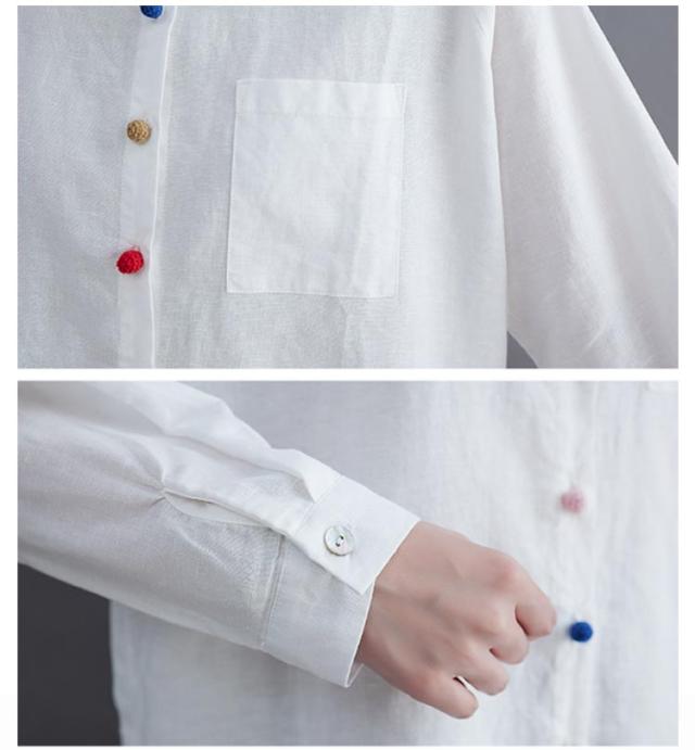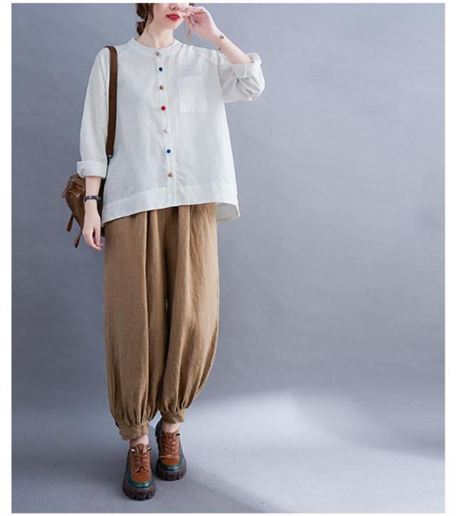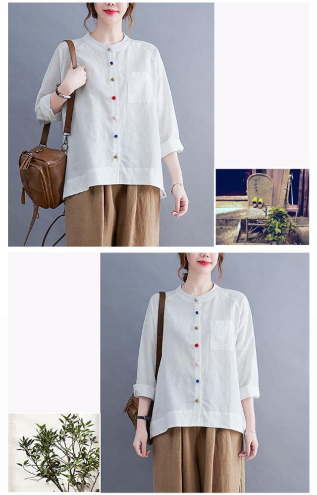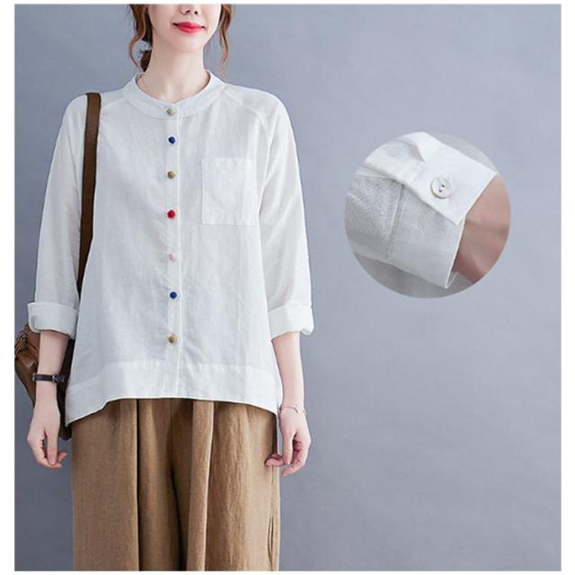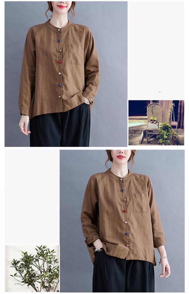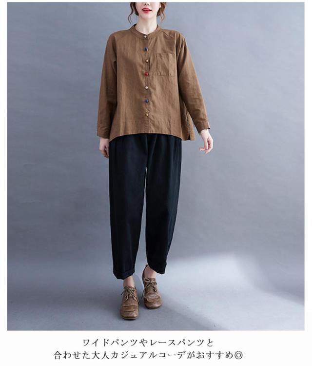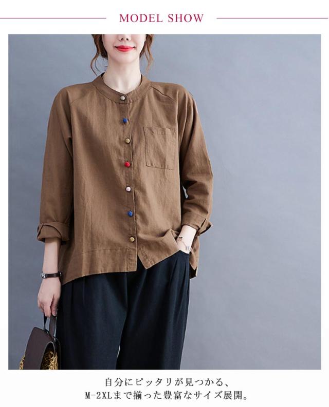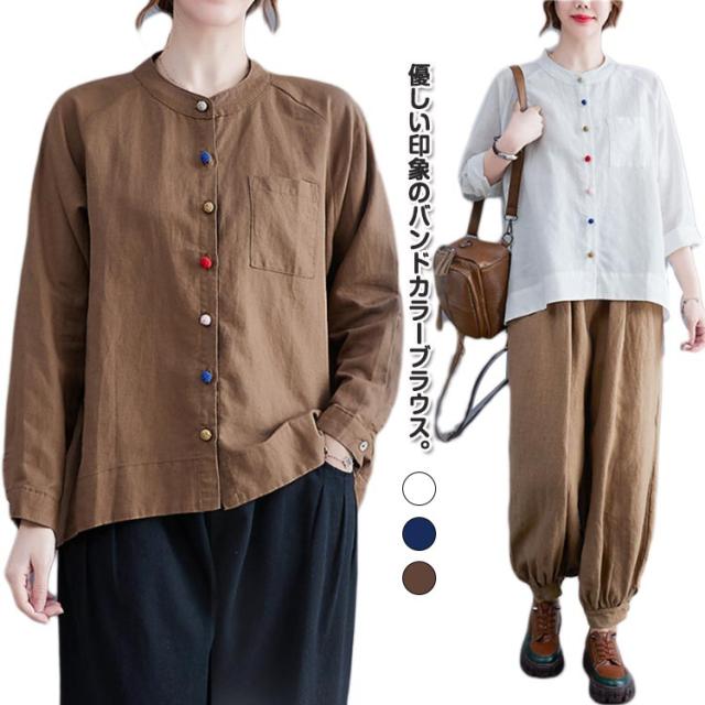 レディース 綿麻 大きいサイズ カジュアル ブラウス 綿麻ブラウス リネンブラウス カラーボタン スタンドカラー 長袖 リネンシャツ シャツ シンプル トップス キレイめ 綿麻混 通勤 オフィス 痩せる効果 お出かけ