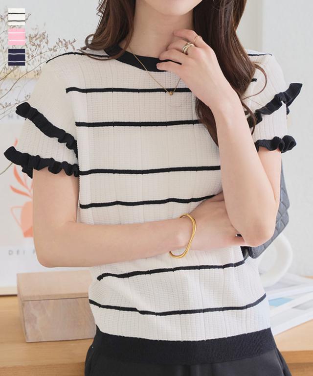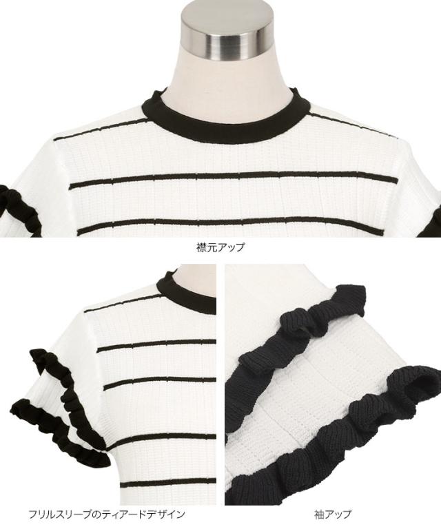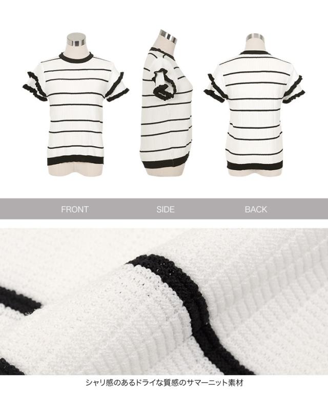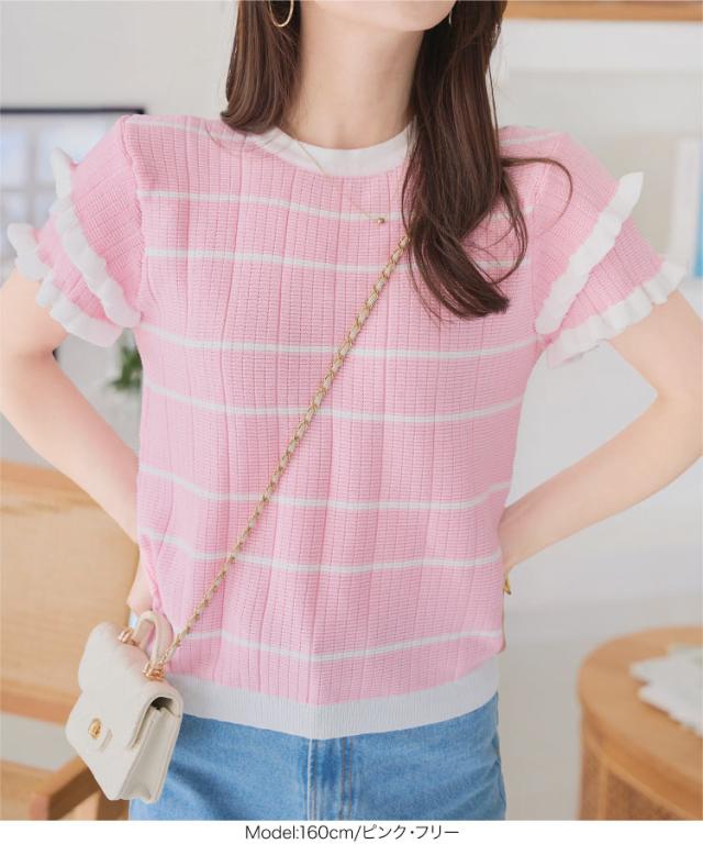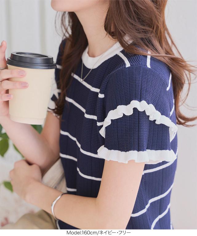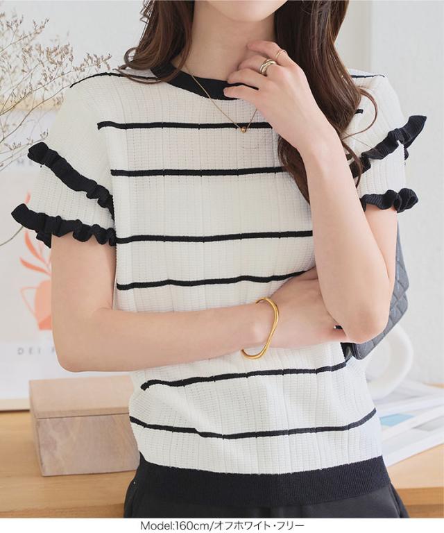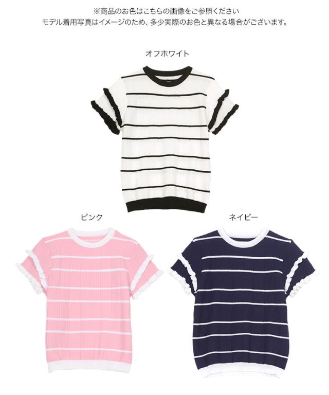ティアードスリーブサマーニットトップス N1223 入荷済 サマーニット ボーダー ストライプ 半袖 フリル フェミニン レディース ティアード バイカラー 夏トップス 5分袖 ピンク ネイビー オフホワイト 大人 大人かわいい 綺麗め きれい 韓国