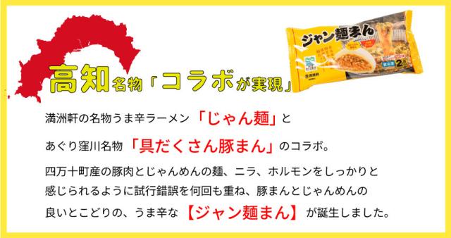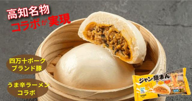 四万十生まれ、四万十育ちの具だくさん豚まんと、うま辛ラーメンがコラボしたジャン麺まん。