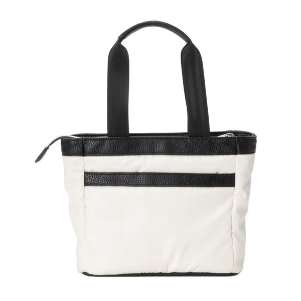 艶のあるポリエステル生地にワタ加工しており、風合いが良い。ハンドル部分には合皮を使用。天マチ付きでファスナー開口。