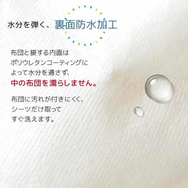 「布団と接する内面はポリウレタンコーティングによって水分を通さず、中の布団を濡らしません。」