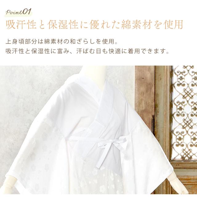 上半身部分は吸汗性と保湿性に優れた綿素材、袖と裾よけ部分は滑りのいい楊柳(ようりゅう)素材で快適な着心地です。