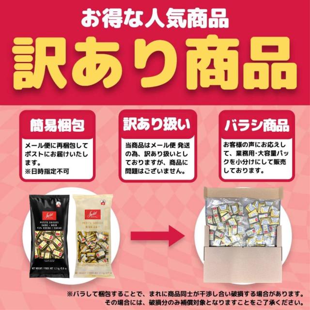 | その他 | ・スイスの有名チョコレートブランド「スイスデリス」の、クリーミーで本格的なダークチョコレートとミルクチョコレートをお楽しみください。 ・ひと粒ずつ個別装になっているのでコーヒーブレイクのお供や家族・友達とのシェアにもぴったりです。 |
