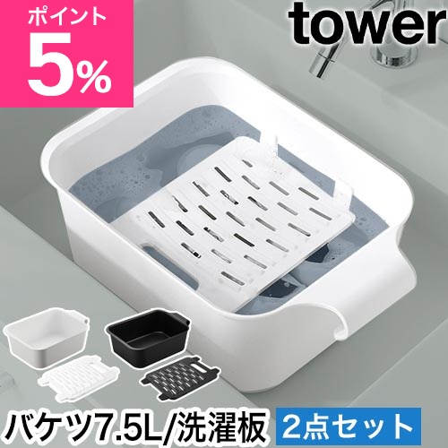 山崎実業 マグネット&引っ掛けバケツ 7.5L&バケツで使える洗濯&つけ置き板 タワー 洗濯板 落とし蓋 ウォッシュボード 四角 靴下 つけおき おしゃれ 洗濯 コンパクト つけ置き洗い 泥汚れ tower yamazaki タワーシリーズ