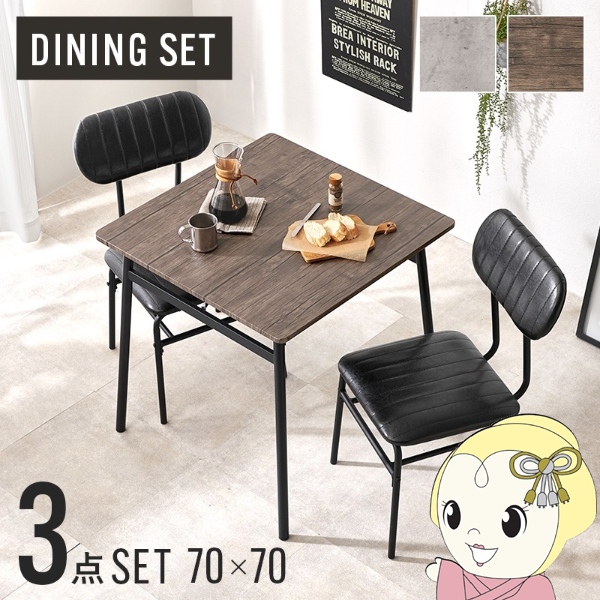 クッション性のある座面で座り心地の良い、コンパクトなダイニング3点セット。落ち着きのあるヴィンテージな空間がつくれます。 【カラー】 グレーブラウン 【商品サイズ(約)】 テーブル:幅70×奥行70×高さ70cm チェア:幅45×奥行48×高さ78cm(座面高43cm) 【材質】 天板:合成樹脂化粧繊維板 フレーム:スチール(粉体塗装) クッション材:ウレタンフォーム 生地:合成皮革 【生産国】中国 【備考】組立品 ※お客様組立て品につきましては、組み立て後に不良の連絡をされても対応ができません。組み立て前にパーツに不良・傷等がないか、必ずご確認下さいますようよろしくお願い申し上げます。 ※記載は商品仕様の一部です。仕様説明不足等の理由での返品はできません。特に適合等は必ずご確認ください。