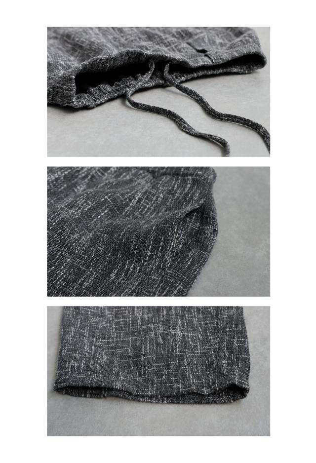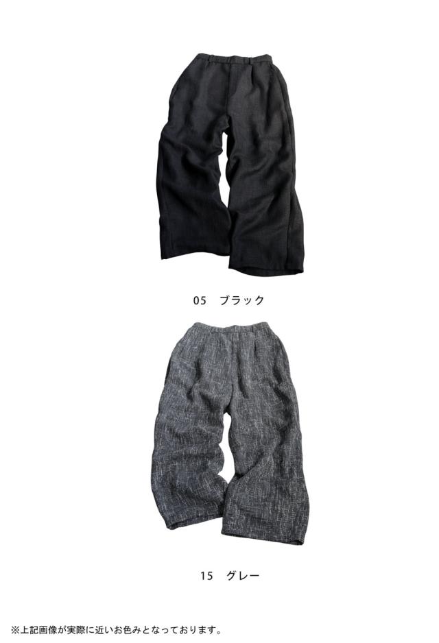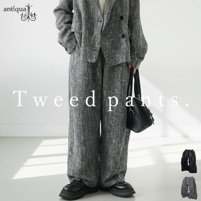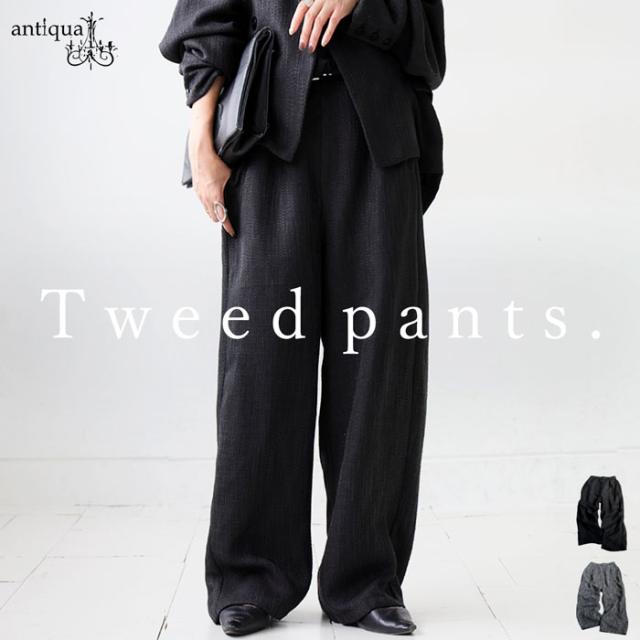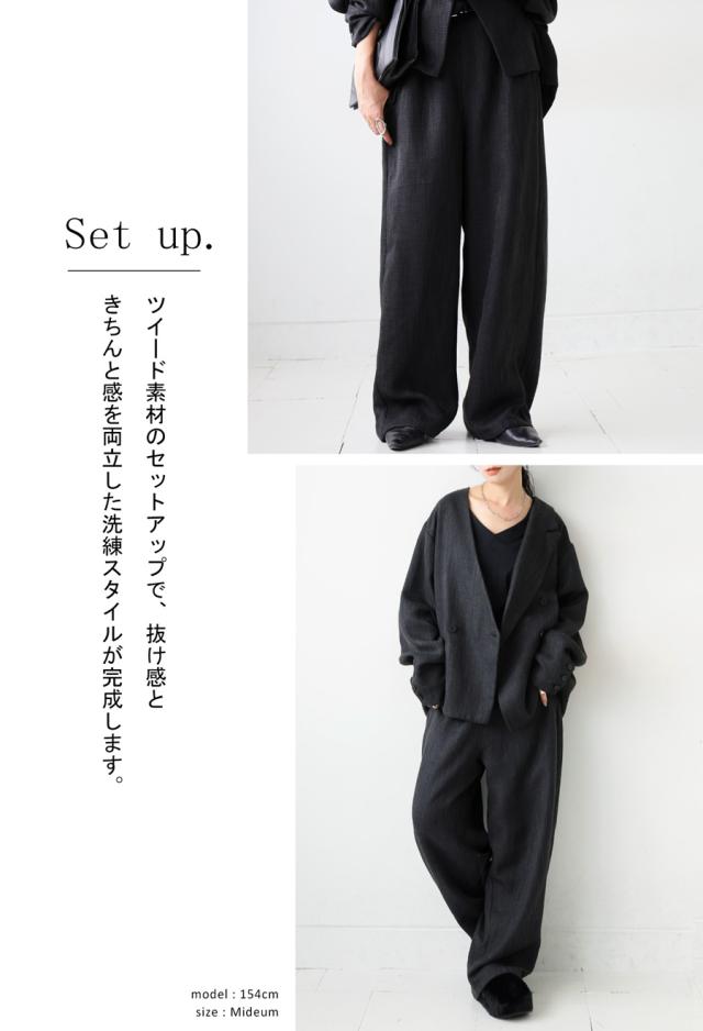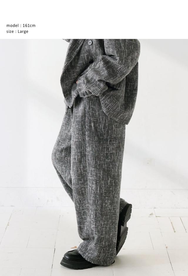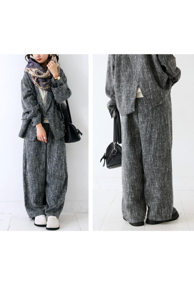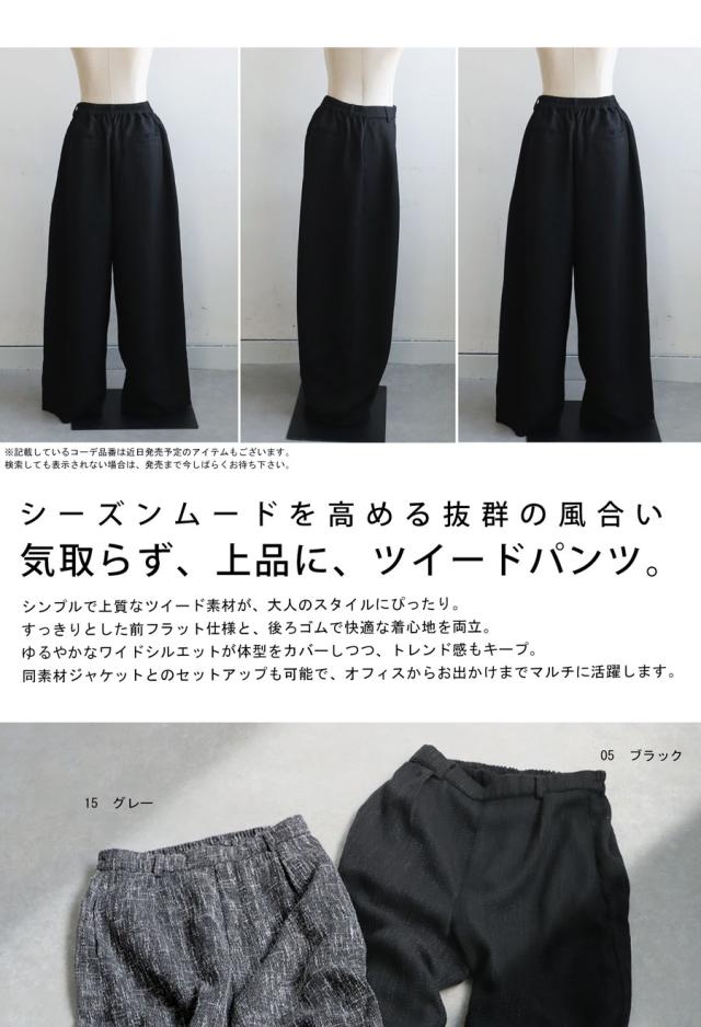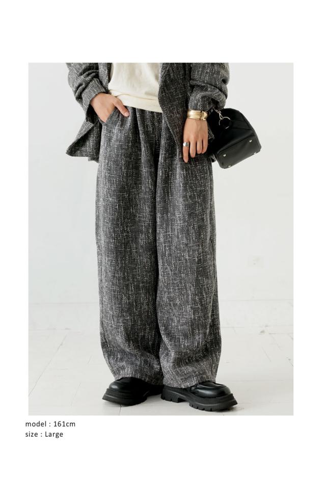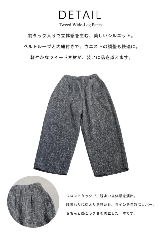 奥行きあるツイード柄の織り素材が上品な印象を与えるワイドパンツです。
