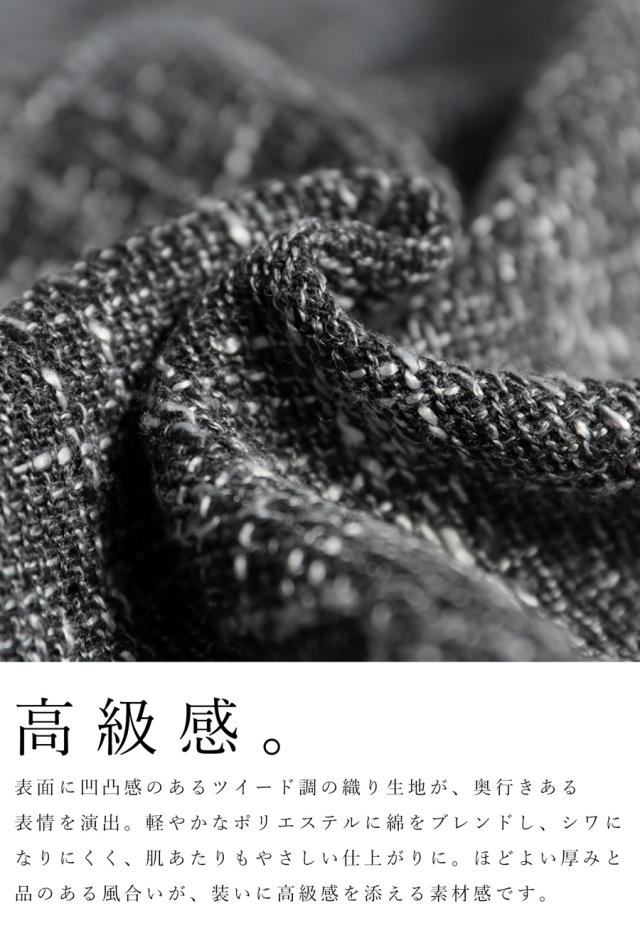 柄は立体感のある杢調のツイード風で、装いにニュアンスと高級感を加えます。