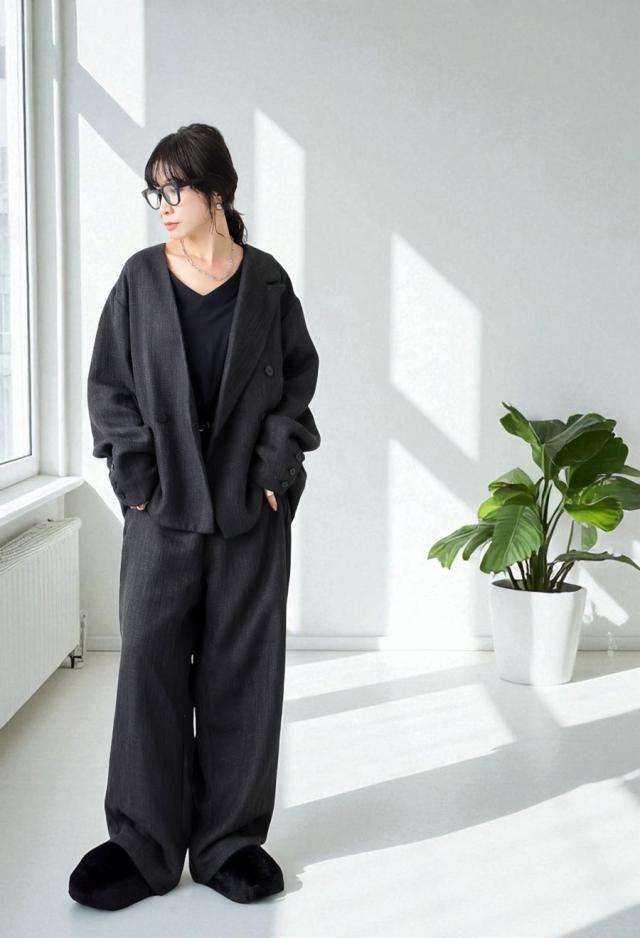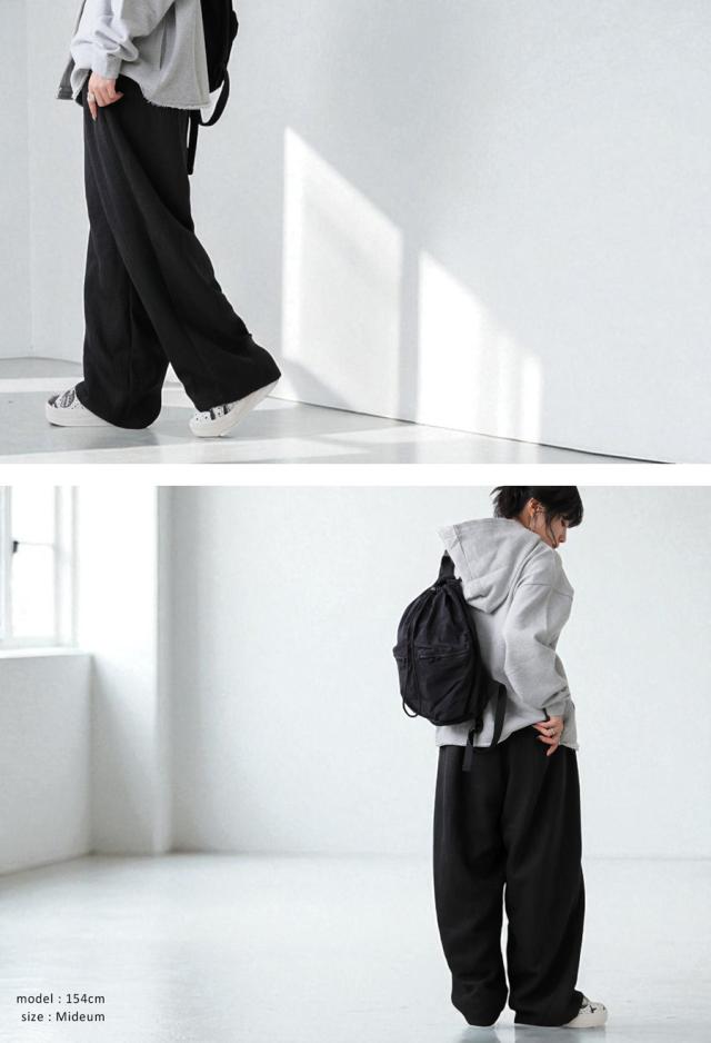 形状はストンと落ちるワイドシルエットで、ラインを拾わずきれい見えを実現。