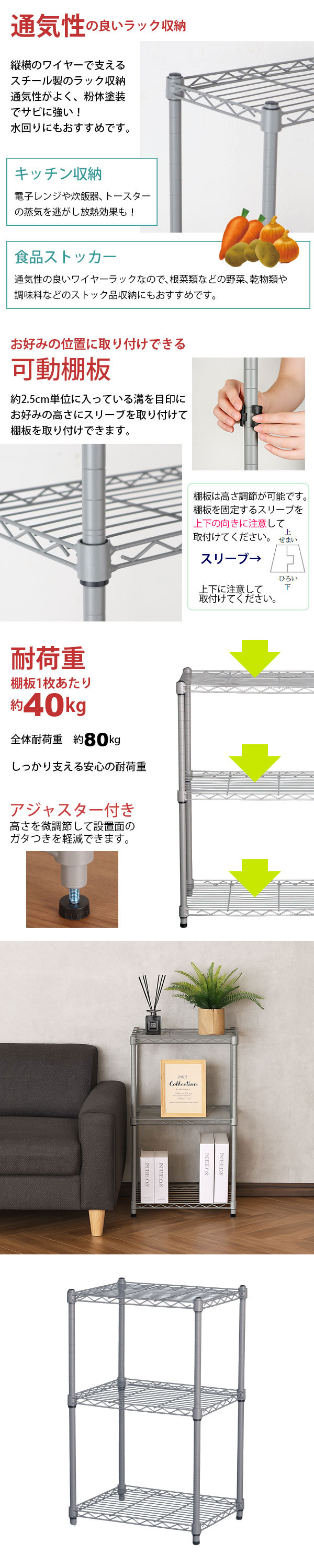 19Φ(直径19mm)の支柱とワイヤーの棚板でしっかり支える耐荷重棚板1枚あたり約40kg