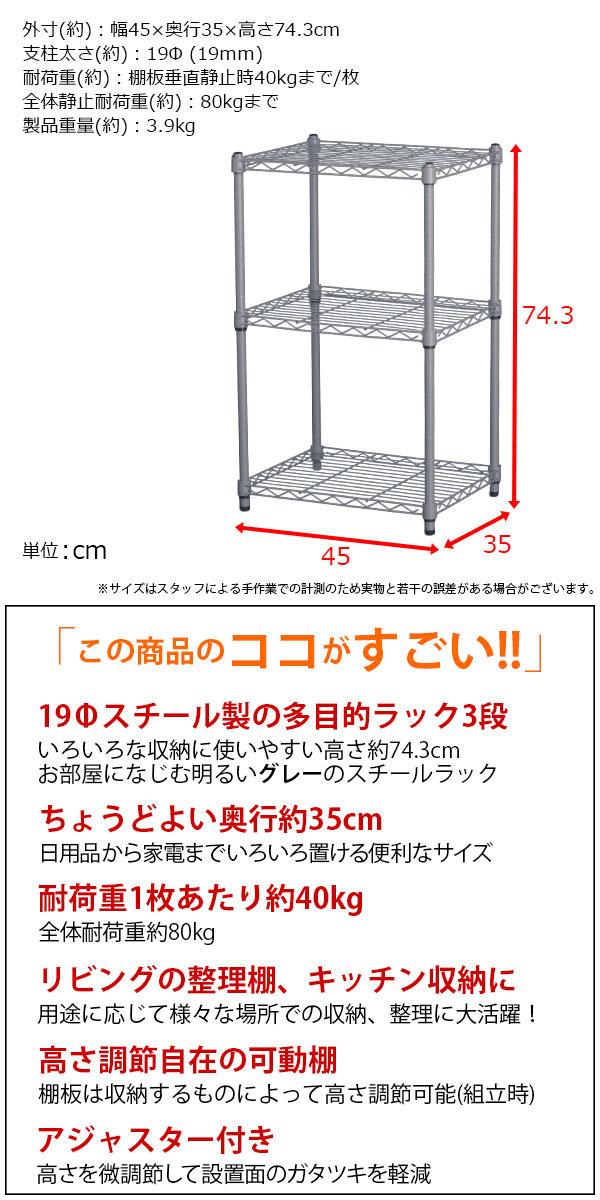 幅約45cm 奥行約35cm 高さ約74.3cm 耐荷重約40kg(1枚あたり) ガタつき調節可能アジャスター付き