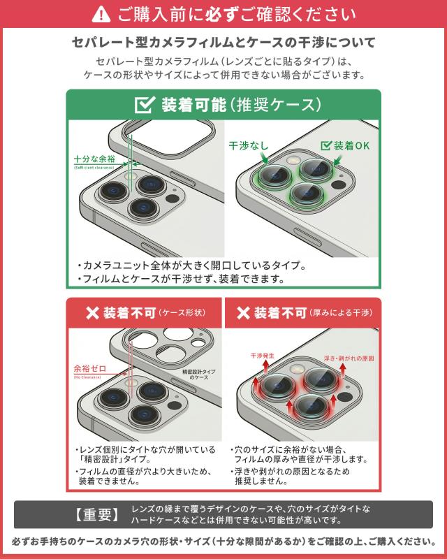 [ カメラレンズ保護フィルム ] 【 優れた5つの ポイント 】 (1) 特殊な強化ガラスを使用し、カメラレンズを全面的に保護。 (2) 高透明フィルムで、内側の黒い輪が光の反射を抑えます。 (3) 汚れや指紋がつきにくく、突然の雨からもレンズを守ります。 (4) 黒縁取りのデザインにより、カメラの露出を適切にコントロールします。 (5) ガイド枠一体型で、初心者でも簡単に貼り付けられます。 【 高透明度 】 高透過率のフィルムで、写真の美しさをそのまま保ちます。 【 黒縁取り設計 】 カメラレンズに黒縁取りを施し、露出オーバーを防止。明るい被写体でも暗い被写体でも適切な明るさで撮影できます。 【 汚れ防止・指紋防止 】 特殊コーティング加工により、汚れや指紋がつきにくく、簡単に拭き取れます。 【 飛散防止 】 万が一割れた場合でも安全な飛散防止加工で、ケガの心配なく新しいフィルムに交換できます。 【 簡単貼り付け 】 ガイド枠一体型で、気泡が入りにくく、誰でも簡単に貼り付け可能。 |