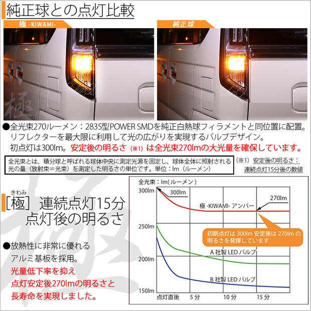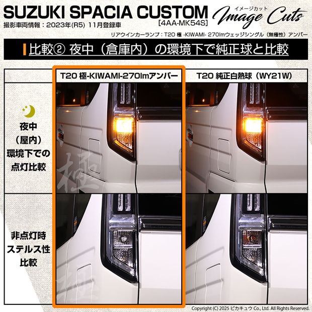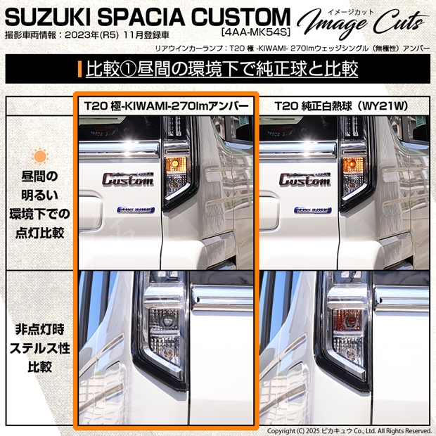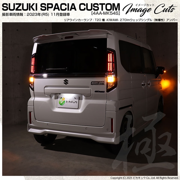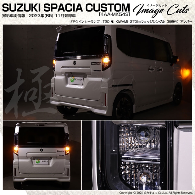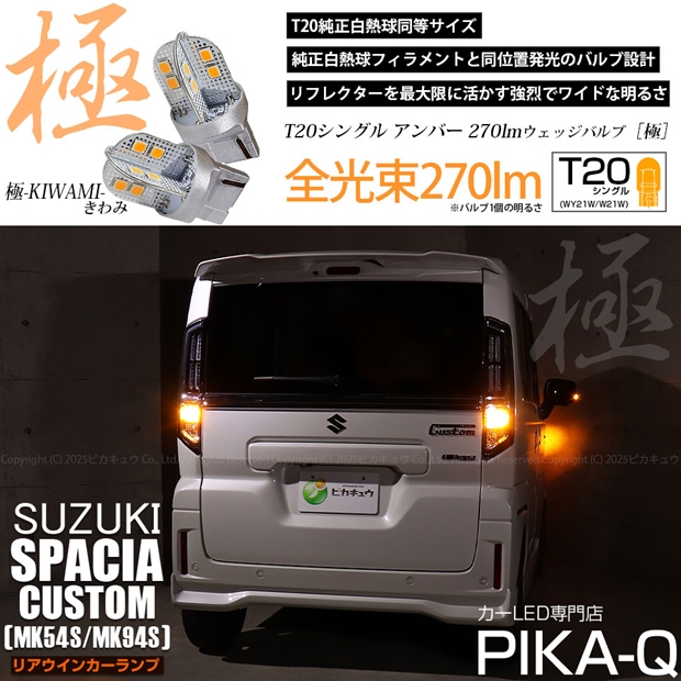 ピカキュウ,LED専門店,LEDバルブ,国産DC12V車,ハイブリッド車対応LEDバルブ,T20シングル,W21W/WY21W兼用,ウインカーランプ,アンバー,全光束300lm,全光束270lm,極,KIWAMI,きわみ,スズキ,SUZUKI,スペーシアカスタム,SPACIA CUSTOM,MK54S,MK94S