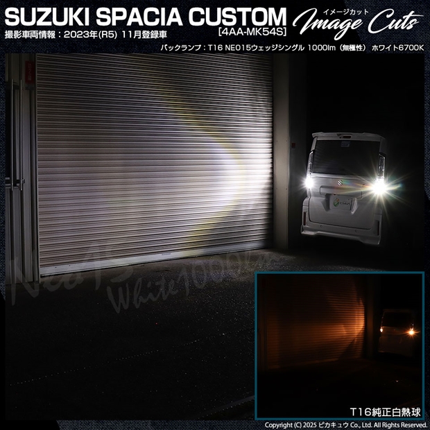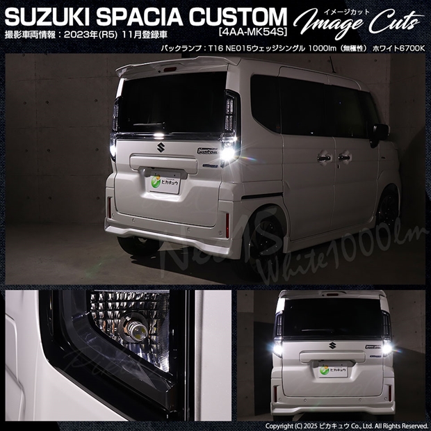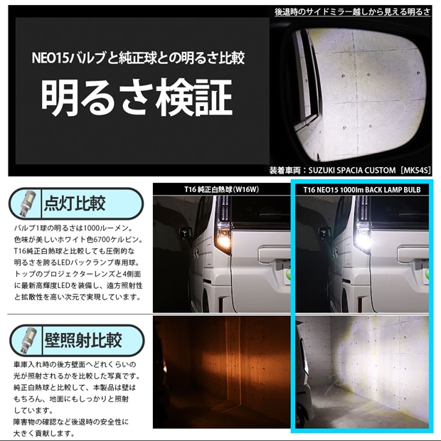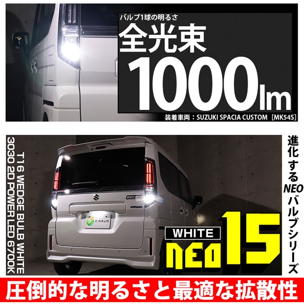 ピカキュウ,LED専門店,LEDバルブ,国産DC12V車,ハイブリッド車対応LEDバルブ,T16シングル,W16W,バックランプ,ホワイト,全光束1000lm,NEO15,スズキ,SUZUKI,スペーシアカスタム,SPACIA CUSTOM,MK54S,MK94S