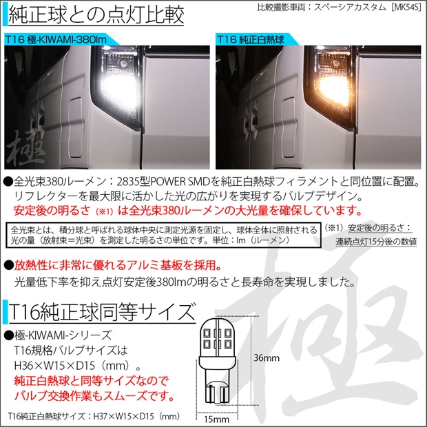 スズキ スペーシアカスタム (MK54S/MK94S) 対応 バックランプ LEDバルブ T16 極-KIWAMI- 380lm ホワイト 6600K 2個 後退灯 5-A-6