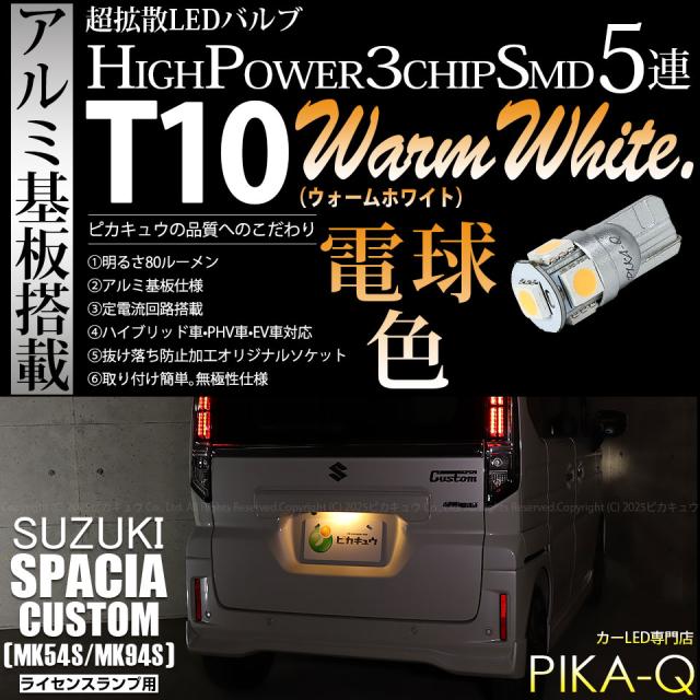 ピカキュウ,LED専門店,LEDバルブ,LED,SMD,T10,W5W,T10 HIGH POWER 3CHIP SMD 5連ウェッジシングル球,ウォームホワイト(電球色),ライセンスランプ,番号灯,スズキ,SUZUKI,スペーシアカスタム,SPACIA CUSTOM,MK54S,MK94S