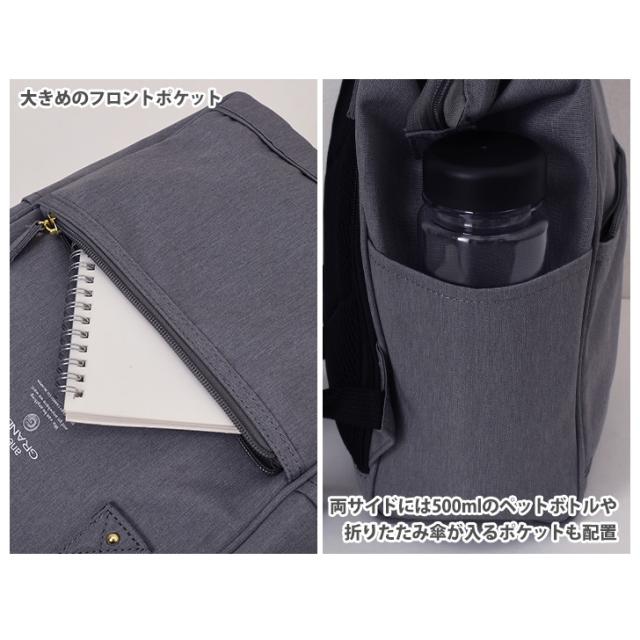 両サイドには500mlのペットボトルや折りたたみ傘が入るポケットも配置