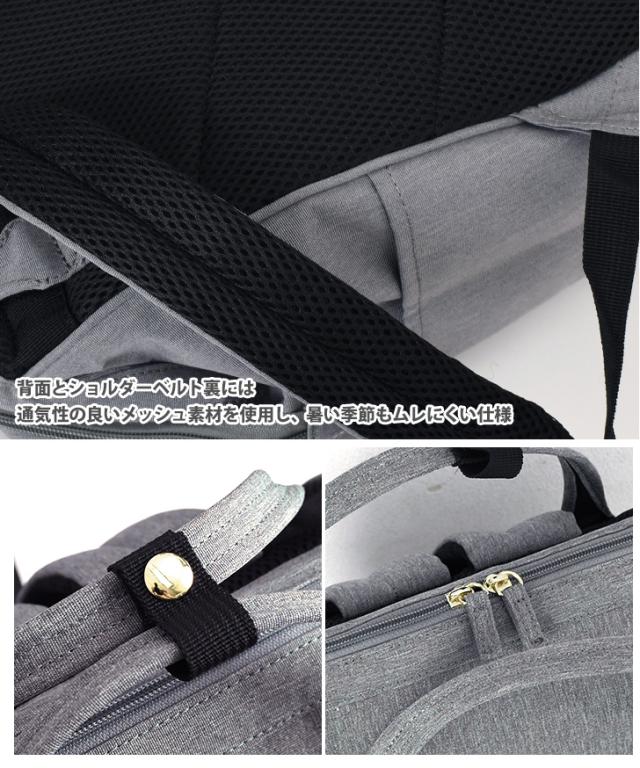 背面とショルダーベルト裏には通気性の良いメッシュ素材を使用し、暑い季節もムレにくい仕様