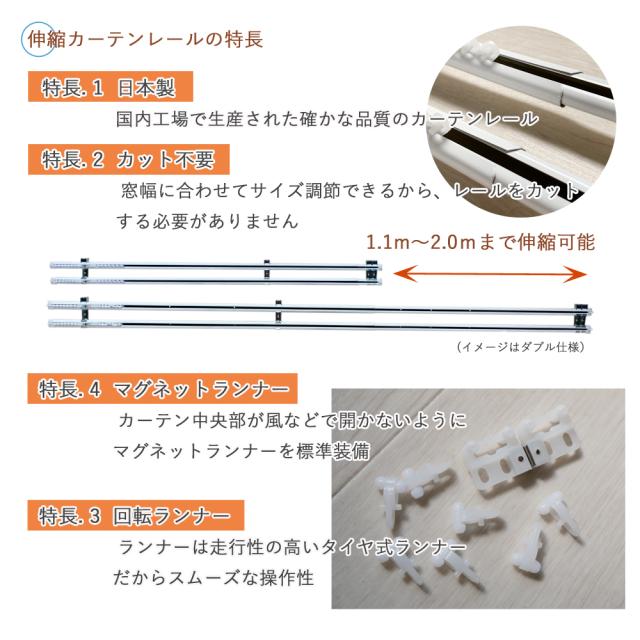 セット内容(レール1セットあたり):1.1〜2.0m伸縮式レール本体x2 ランナー28個 ブラケットx4個