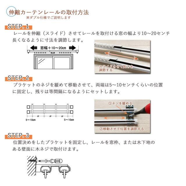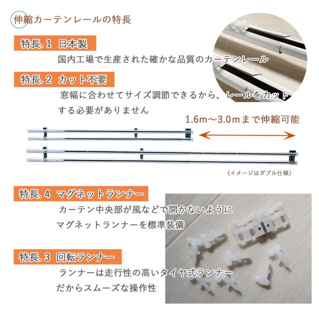 セット内容(レール1セットあたり):1.6〜3.0m伸縮式レール本体x2 ランナー44個 ブラケットx6個