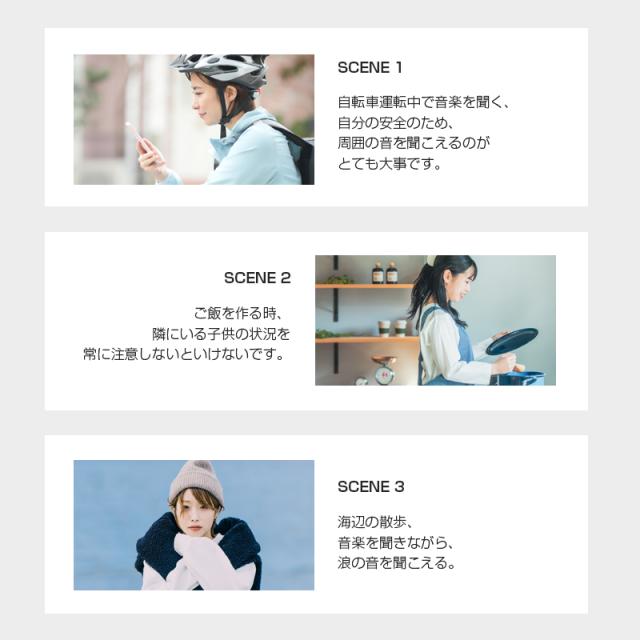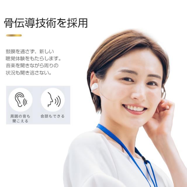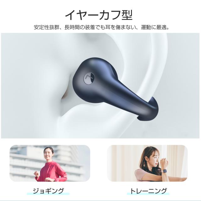 【骨伝導イヤホン】どんな耳の形にもフィットするイヤーカフ構造の骨伝導イヤホンは、一般の耳かけ式と違って、耳介に挟むように装着します。イヤホンが入りにくい耳穴でも問題なし!骨伝導イヤホンは耳をふさがないので、テレワーク・スポーツ・移動中など、全ての場面でながら聴きしながら作業可能です。また、左右完全分離に進化しました。煩わしいネックバンドなどを気にすることなくどんなヘアスタイルでも快適に装着いただけます。