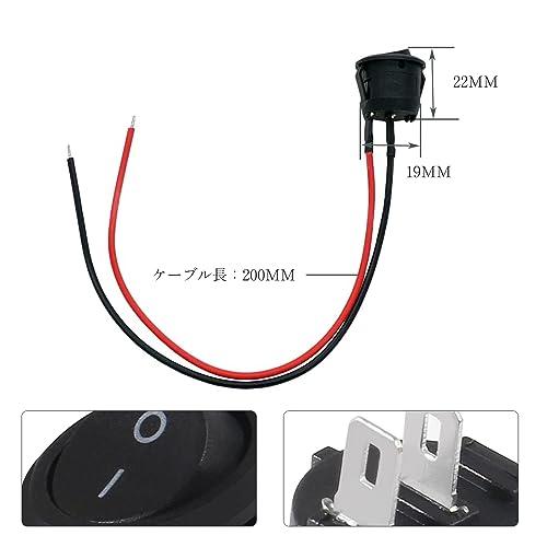 【商品内容】配線付き丸型スイッチ10個セット(ロッカースイッチ) 寸法:22mm*19mm 配線の長さ200mm 定格動作電圧、電流:3A/6A/15A 250V、接触抵抗:[0.03Ω、電気寿命:1万サイクル以上、動作温度範囲:-25+85 °C