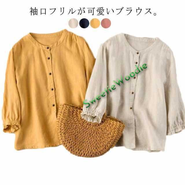 前開き ブラウス 綿麻 リネンブラウス ナチュラル 七分袖 ブラウス レディース 春夏 スタンドカラー トップス フリル袖 リネン キレイめ 無地 おしゃれ ゆったり かわいい 大きいサイズ