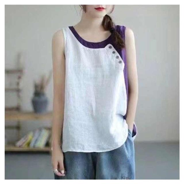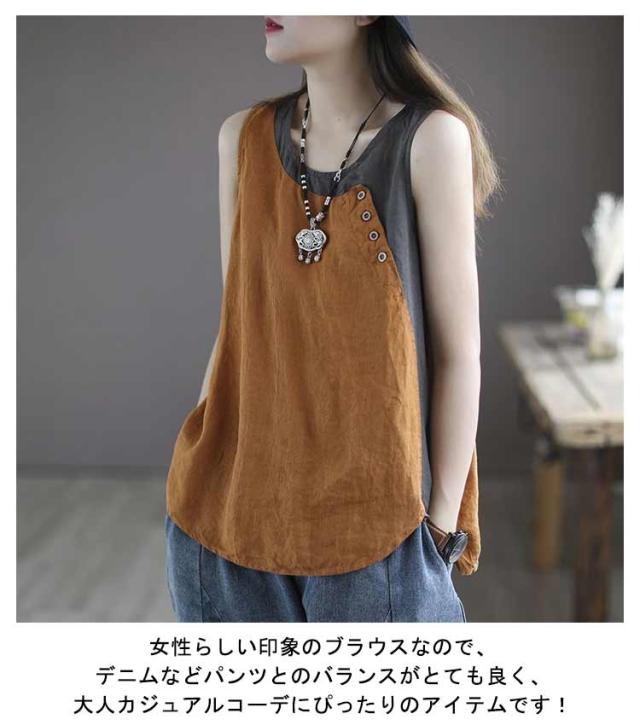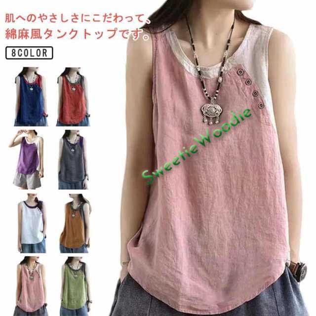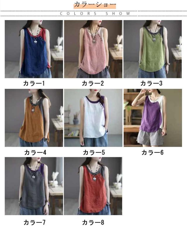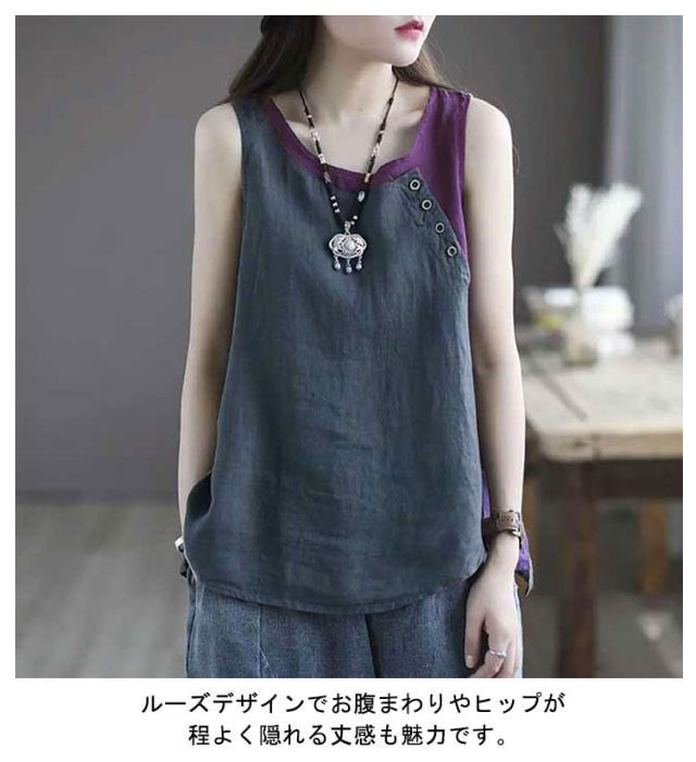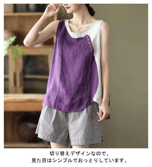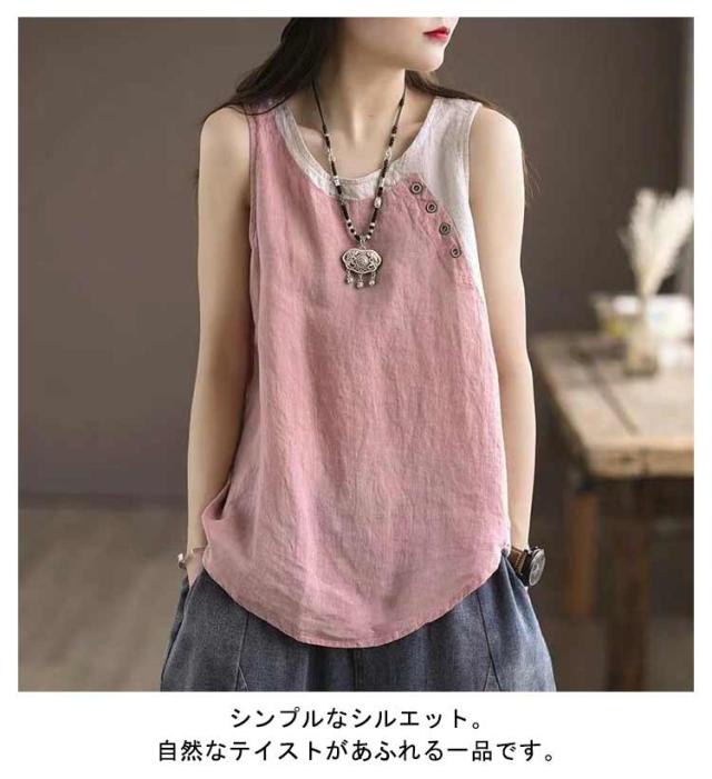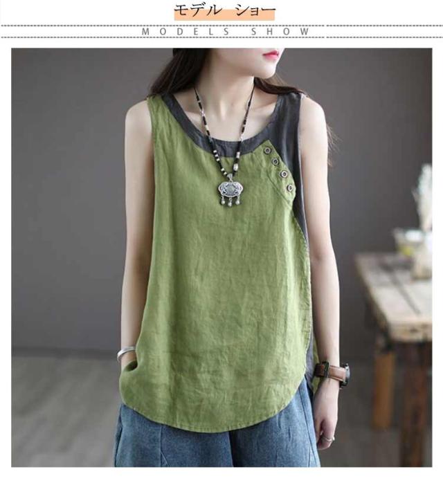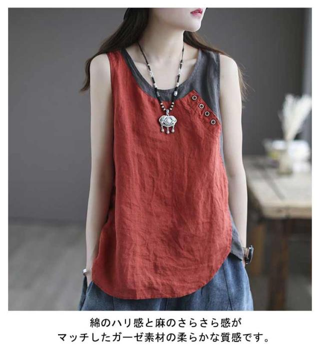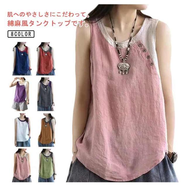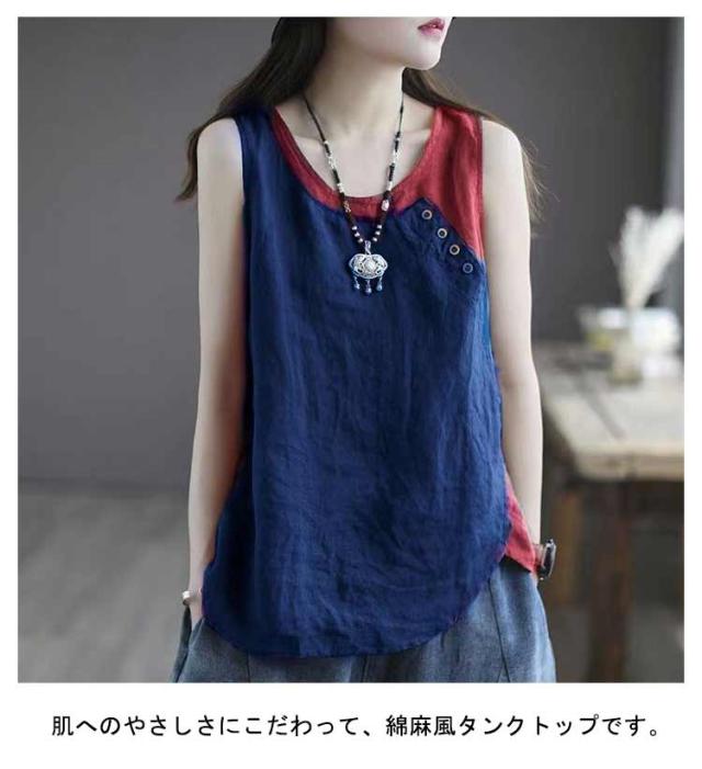 クルーネック タンクトップ レディース ブラウス ノースリーブ ブラウス 綿麻風 薄手 切り替え 配色 タンク 綿麻風 肌着 インナー 下着 サマータンク シンプル オーバーサイズ 綿麻 tシャツ エレガント カジュアル 袖なし 無地