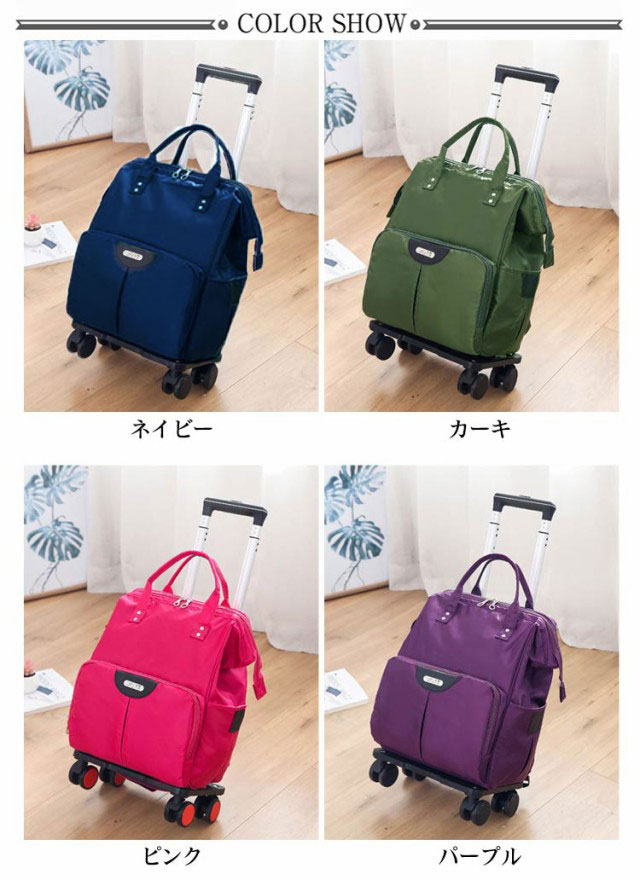| 撥水加工を施した2WAYの折り畳み式4輪キャリーバッグ。【機内持ち込み可◎】 2WAYでリュックにも変更できます。 毎日のショッピングはもちろん、ちょっとした旅行にも気軽に使えます。機内持ち込みも可能サイズ。 4輪タイプで安定感抜群です。 キャリーバーは軽量かつ頑丈のアルミフレームを採用。3段階調整可能。 ナイロン製なので、丈夫で撥水効果も◎。 使わない時折りたたんでコンパクトに収納可能。 前ポケットもしっかり付いているので、ちょっとした時に取り出したい旅のパンフレットや資料なども気軽に入れられます。 【取付簡単】:本体をキャリーバーに通すだけで取付け完成。 | |
